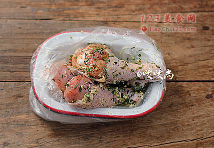 4、取一保鲜袋,把按摩好的琵琶腿和迷迭香大蒜碎混合均匀,调入一点点孜然,再次按摩一会儿,系上袋子放冰箱冷藏腌制一夜入味。