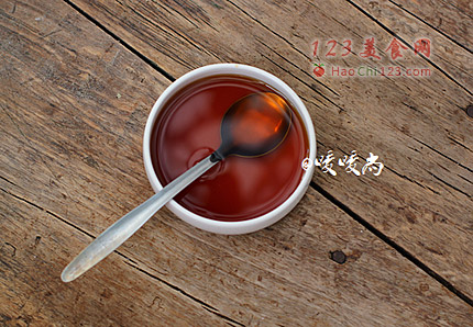 5、蜂蜜温水按照1:1的比例调匀,滴两滴老抽调出漂亮色颜色,一会儿烤琵琶腿刷蜂蜜水上色用。