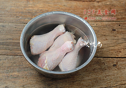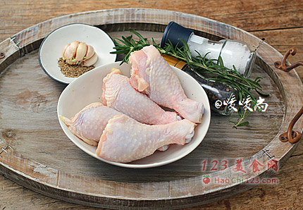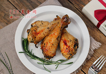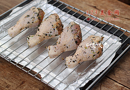 6、腌制过夜的琵琶腿清理掉表面大部分的香草碎,烤箱预热至210度,中层上下火烤30-35分钟,最后10分钟取出琵琶腿刷蜂蜜水后放进烤箱上层烤制上色即可食用。