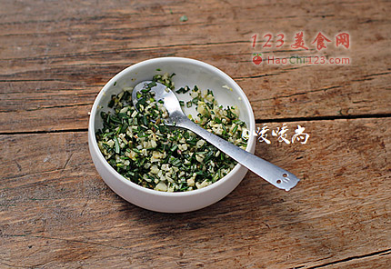 2、新鲜迷迭香洗净控干水份和剥好的大蒜一起切成碎粒,加入一点橄榄油和海盐拌匀备用。