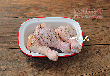 3、浸泡后的琵琶腿擦干表面水分,用小叉子在表面戳几个洞,方便一会儿腌制入味。均匀的撒上海盐和黑胡椒碎,按摩一会儿。