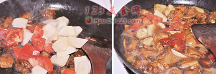 7、等鸡翅全部变色,里面的腌料汁都充分吸收掉,放入切好的西红柿和土豆,翻炒均匀。