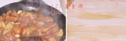 10、醒好的面,用双手抻成宽的细长条,很好抻,然后从中间扯开,放入煮开的水里,等所有面条都放进去,锅开之后,面条浮上来,就可以出锅了。面条出锅之后放在盘子上,再把炒好的鸡翅放在上面,最后浇上汤汁就可以享用啦。