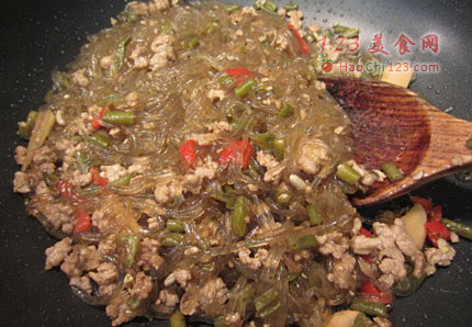 5、放入肉末翻炒到9成熟,加入苕粉翻炒,加点酱油调味。如果你喜欢味道甜一点,最后可以放点糖翻炒调味。