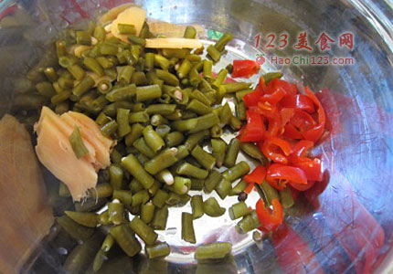 4、油锅先炒香泡姜,下酸豆角丁和泡椒丁,加很少的盐,因为豆角和辣椒在酸水里已经是咸的了。