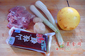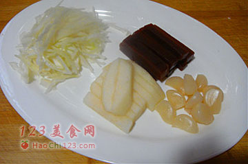 3、葱切眉毛丝、鸭梨、山楂糕分别切条;糖蒜剥好备用。