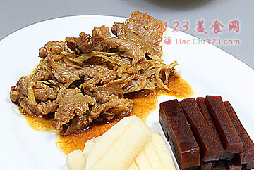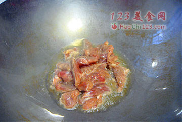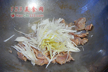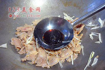 5、羊肉变色以后,放入眉毛葱丝煸炒。