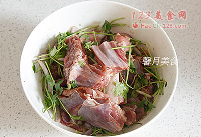 2、加入拌好的椒盐,再加入生抽、料酒、姜片、葱段、粗洋葱丝、香菜段。
