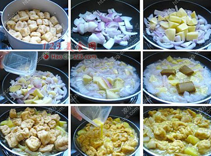 5、继续倒入抄好水的豆泡同咖喱汁一起焖煮一小会,直到豆泡浸满咖喱汁。