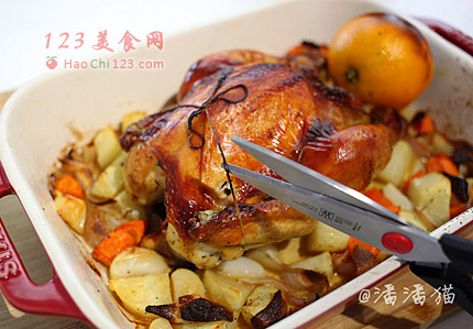 9、剪断棉绳,并将棉绳取出。此时的橙子有一半皮都烤焦了。甜甜的橙味也融入到了鸡的身体里。