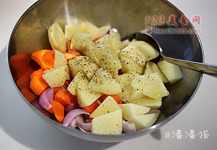 4、准备好需要的各种蔬菜,胡萝卜和土豆去皮,其他菜洗干净。胡萝卜和土豆切小块,洋葱切大块、蒜去皮掰成瓣,加入橄榄油、少许黑胡椒和盐拌匀备用。