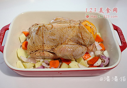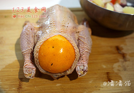 5、将一部分土豆、胡萝卜、洋葱和蒜填满鸡肚子。用橙子堵住鸡PP,这样可以保持鸡的水分。橙子的香气也能为烤鸡增添果香味。