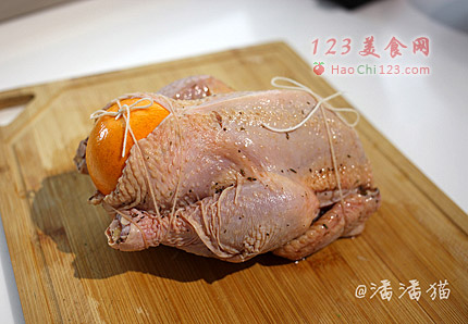 6、这只鸡也是怪可怜的,不仅被塞上了橙子,还要被棉线五花大绑。用面棉捆好鸡以免在烤的过程中,鸡的造型会过于奔放。
