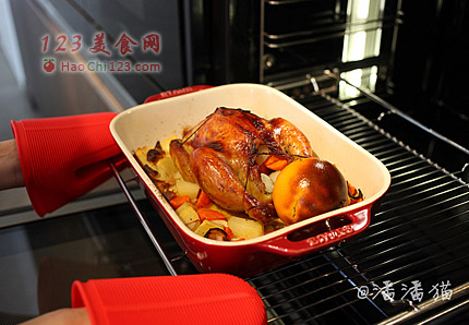 8、将鸡送入烤箱,上下火加热,用190度的温度烤60分钟。当然,这个烤制的时间因鸡的大小和烤箱的功率而定,表面上色,用尖头筷子叉最后的部位,可以不费力的插进去就表示熟啦。