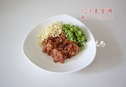 2、猪肉洗净切成肉末,加盐、淀粉、料酒抓匀腌制15分钟。大葱、蒜切末。