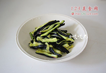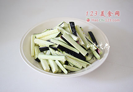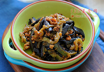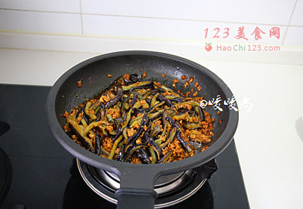 8、下炒软的茄条,翻炒均匀至肉酱均匀的裹在茄条上即可关火开吃。