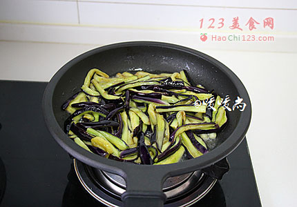 5、平底锅内放稍多一点的花生油,下攥干水分的茄子中小火煸炒至茄子变软盛出。