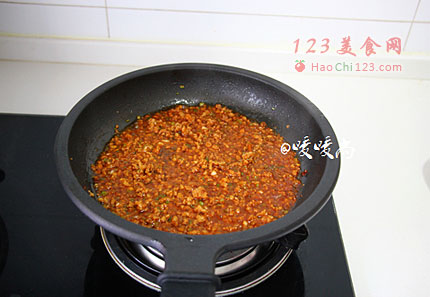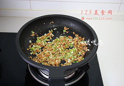6、利用锅底的余油,下腌制好的肉末快速炒至变色,然后加蒜、葱末炒出香味。