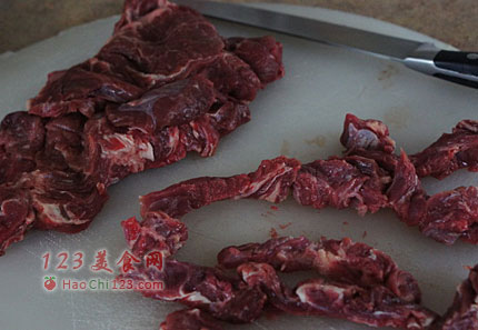 2、牛肉用厨房纸擦干水分,切成1-1.5厘米厚牛肉条。