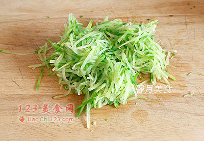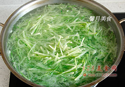 2、水再次滚开后将萝卜丝取出过凉水,攥干水份,略切几刀,不用切的太碎。