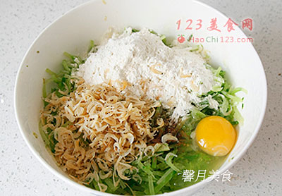3、将萝卜丝入盆中,加入虾皮,半碗面粉和淀粉,一个鸡蛋,入五香粉,胡椒粉,一勺油拌匀(调料可按萝卜的多少和自家的口味适量调整,加粉的量要按萝卜丝的多少来定,一个中等大小的萝卜加入半碗的粉类就差不多了。粉多了丸子内部会沾,口感不好)。