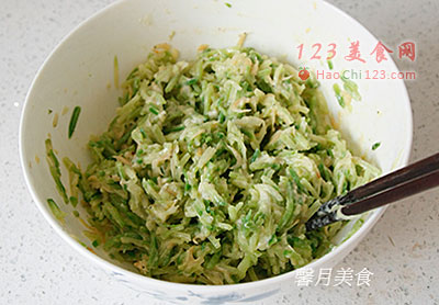 4、把原料翻拌均匀即可,无需过度搅拌,加入适量盐拌匀(过度搅拌容易出汤)。