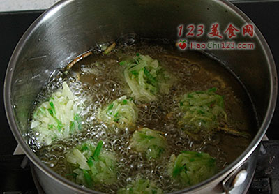 5、取一个小锅加入油,油加热到约5,6成左右,微泛起青烟的时侯,把丸子略攥攥成一个个小团状,入锅中炸制(油温控制着不要太高。火力以中小火,猛火油温高表皮会立即焦掉卖相不好)。