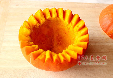 4、南瓜洗净外皮,沿顶部1/4处切开,切三角形花刀,用勺子除去南瓜籽,即成南瓜盅。