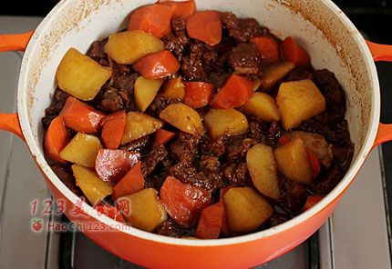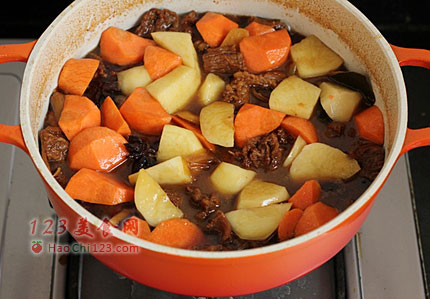 3、胡萝卜和土豆不能早放,否则牛腩没煮烂,它们早已煮烂,会影响卖相和口感。