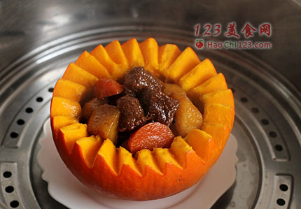 7、将烧好的牛腩放入南瓜盅内,入烧开水的蒸锅中蒸15分钟即可。