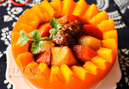 8、这道红火金瓜牛腩盅造型精致,特吸引眼球,绝对是年夜饭餐桌上的一道亮丽风景。其主要原料有牛腩、南瓜、胡萝卜和土豆,荤素搭配,营养全面。它口感软烂,老少皆宜。