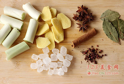 6、将葱段、姜片、八角、桂皮和香叶用筷子夹出,转大火收汁关火。