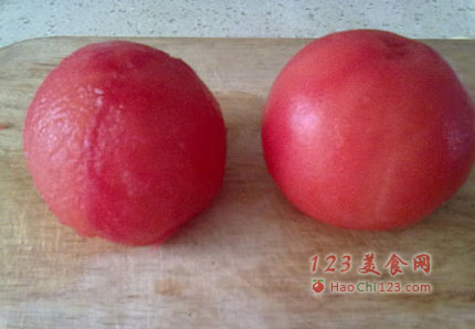 2、西红柿去皮,两种办法。用勺子轻刮西红柿表皮一圈。松过骨,很容易撕下皮。用开水烫下,皮也容易撕下。两种方法比较,左侧松骨的表面没有右侧烫的光滑,胜在快,要是一个小西红柿就不值得烧水了。