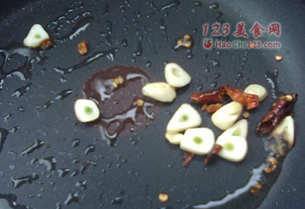 4、在煎锅里先把大蒜和红辣椒炒香。
