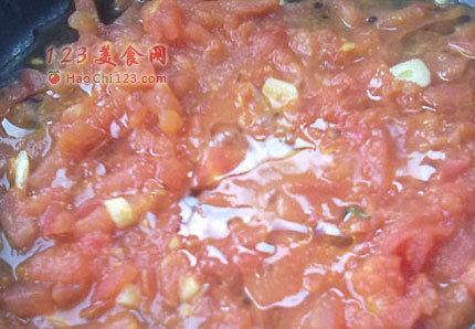 5、放入西红柿,在温火上炒,直到汤汁浓缩。表面浇橄榄油。