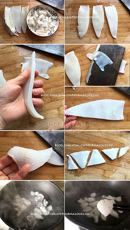 8、9、沸水中加少许白醋,放入,墨鱼汆熟,下水即能看到荔枝花。