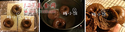 9、排在铺好锡纸的烤盘上,送入预热好200摄℃的烤箱烤8分钟,转175度烤12分钟即可,如图是刚出炉的时候趁热掰开一只的样子,热的时候巧克力是爆浆状的。成品图是凉后切开的效果,巧克力块已经重新凝固起来。