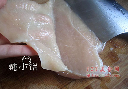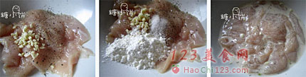 3、片好的鸡肉片加蒜末和黑胡椒。