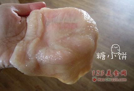 2、然后在连接处反方向再片回去,切断,摊开,这样就是比较大的肉片了,如果想要更大的可以第二次也不切断,同理再片出一片来,考虑到锅子的大小,我就只片成这个样子。