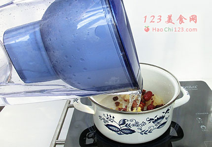 4、红枣、枸杞、干无花果、桂圆洗净,与银耳、皂角米一起放入锅中,倒入用的是碧然德净水壶的过滤水,新鲜的水质可以更好的保留食材中营养成分,同时味道更佳。