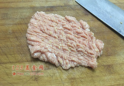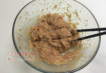 3、搅拌完成的肉馅(其实我搅入的也不是很多,因为搅拌比较费力,我也图省事。这个还可以继续搅拌,你可以去卖小笼包的地方观察下他们搅拌好的肉馅状态,那种湿湿软软,快能流动的感觉)。