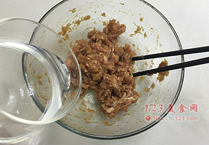 2、加入调味料。分次搅入清水(清水可以换花椒水,效果更好,用热水泡花椒粒即可。一定要记得放凉后再搅入,搅入时一点一点加,顺一个方向搅拌,每次都等完全融合了,再次加入清水)。