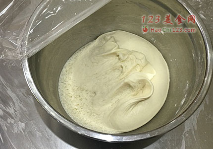 4、清水化开酵母粉,加入面粉揉匀,静置温暖处发酵至两倍大(发酵这一步,放到第一步来操作,揉好了面团再来剁肉就可以了,发酵大约需要1-2小时)。