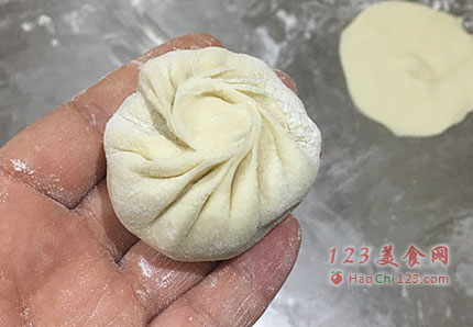 6、擀成中间厚,边缘薄的包子皮。填上馅(馅放入香葱碎拌匀)。捏褶(这一步是最难的了,想要捏出漂亮的褶子,亲们不妨找个视频看看,我也曾发过,在土豆视频网,用户名是双双爱烘焙,其实百度包子捏褶,估计就能出来一大堆,比我包的好看的大有人在,知道了怎么包,剩下的就都是实践了)。
