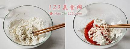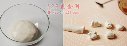 2、用保鲜膜盖住放置15分钟,将面团搓成长条,揪成小挤子,搓成圆球胚。