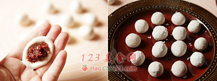 3、将圆球胚中间按出一个小坑,边缘捏薄,填上玫瑰馅,收口,成汤圆,做好的圆放在糯米粉里滚一圈沾上厚厚的的一层粉。