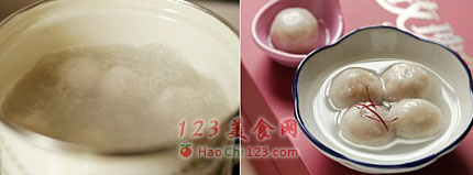 4、汤锅内水烧开,下入汤圆煮至水开,点少许凉水再次煮开至汤圆浮起即可。
