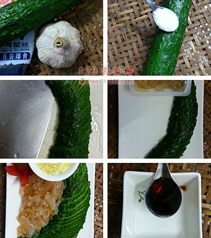 16、最后在吃之前才倒入已经调好的调料的黄瓜和海蜇里。