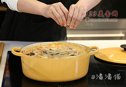 6、放入北极虾,放入贻贝,倒入椰浆,用鱼露调咸味,适当的放一点点糖中和一下咸味会更柔和。