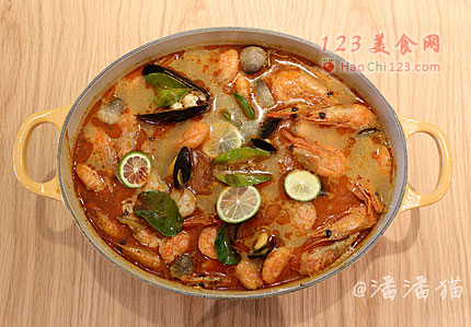 9、最后放入柠檬叶子和柠檬片,特别豪的冬阴功海鲜汤就这么做好了。[LaoYanHuo.com]